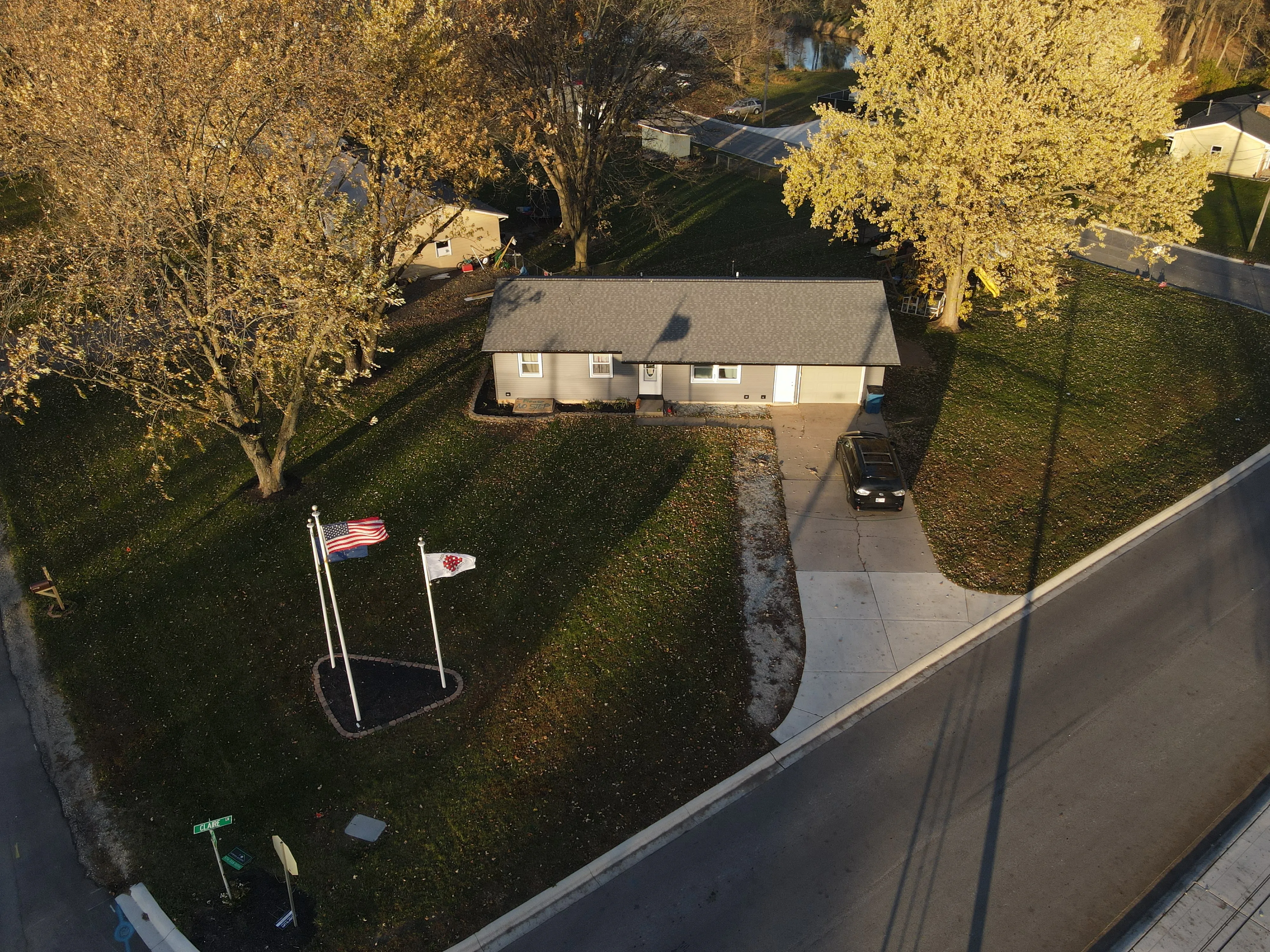 Aerial view of a large light-colored house with a dark gray roof, attached three-car garage, landscaped garden beds, and a green lawn surrounded by trees.