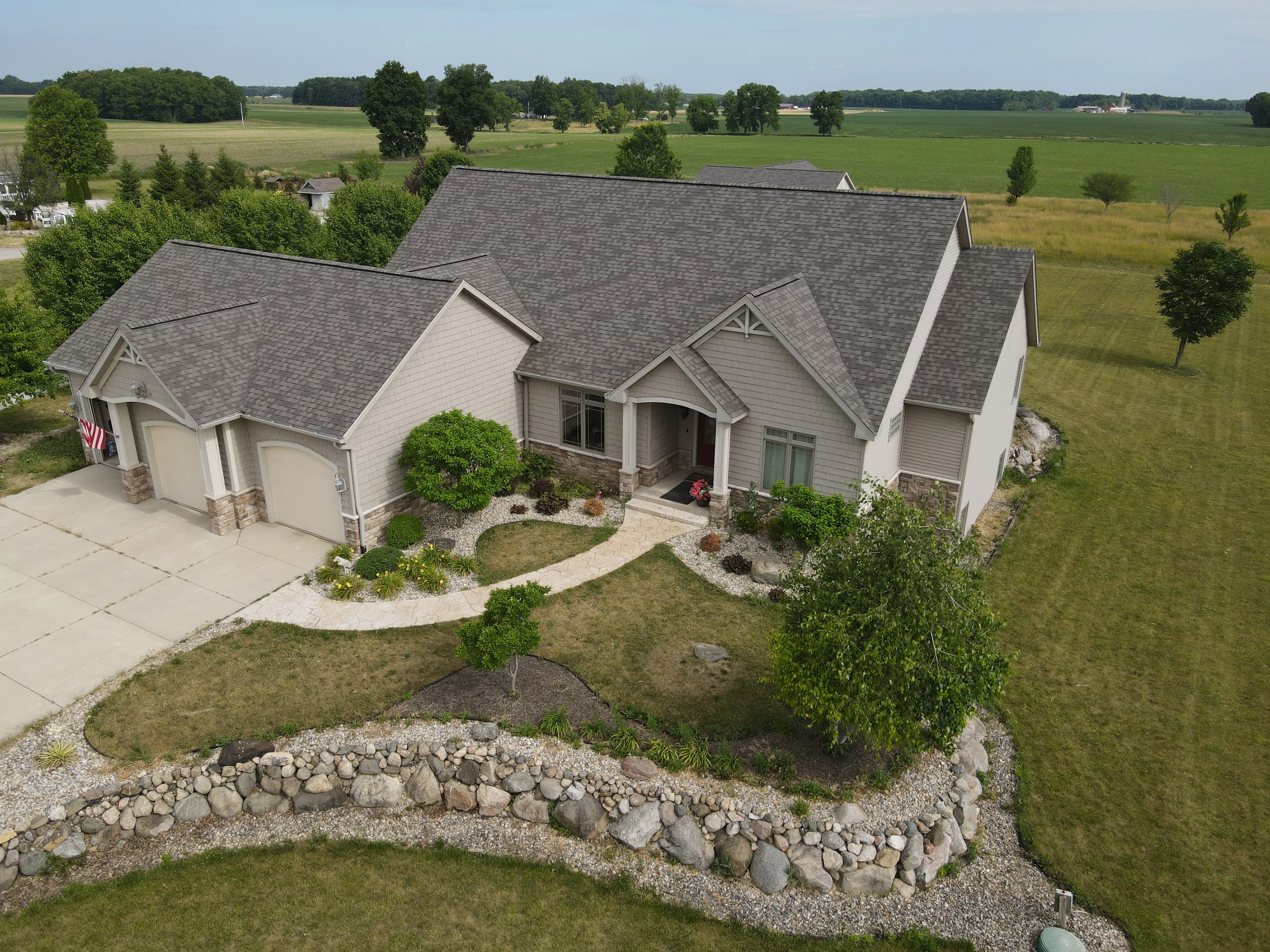 Aerial view of a large light-colored house with a dark gray roof, attached three-car garage, landscaped garden beds, and a green lawn surrounded by trees.