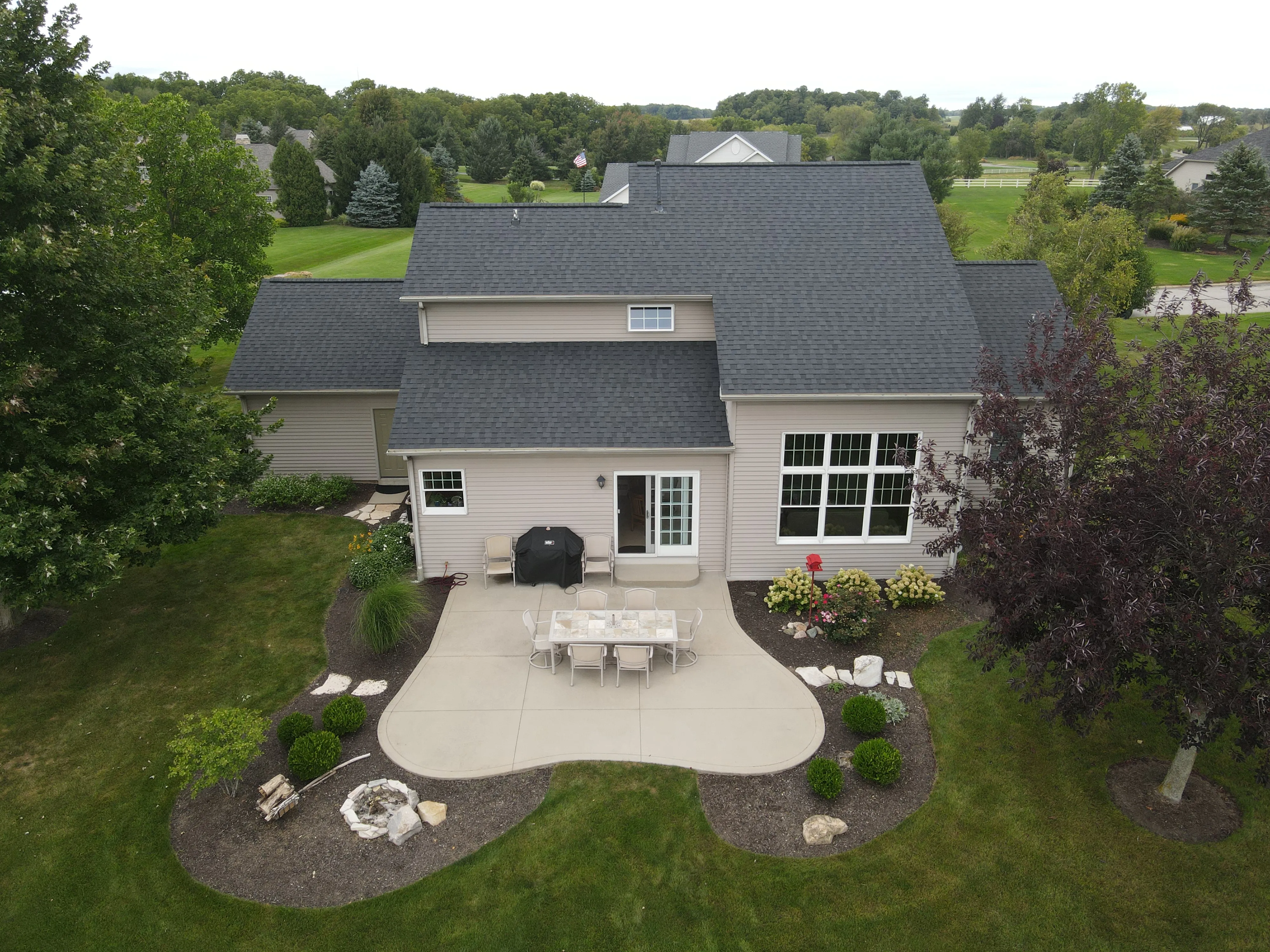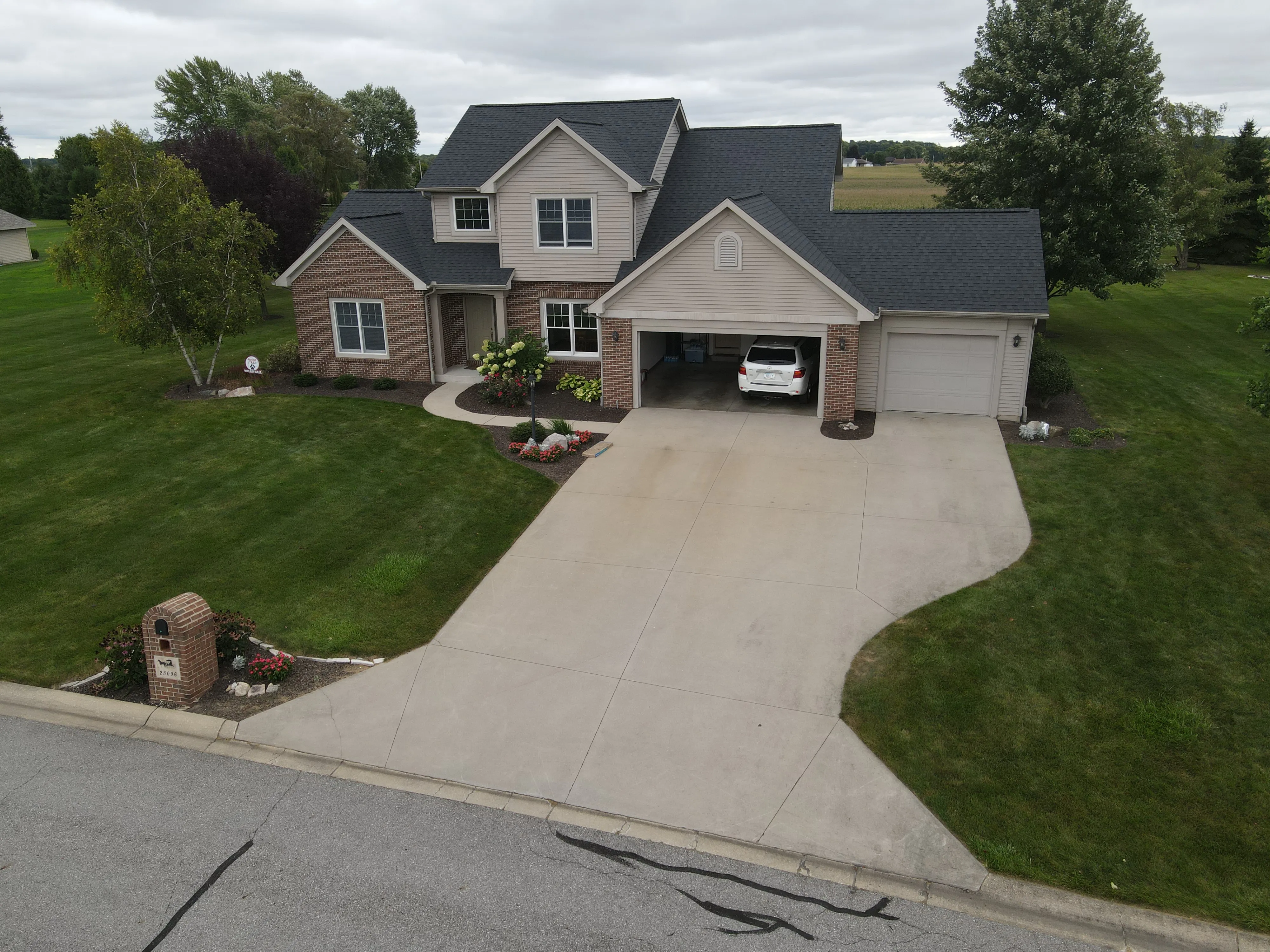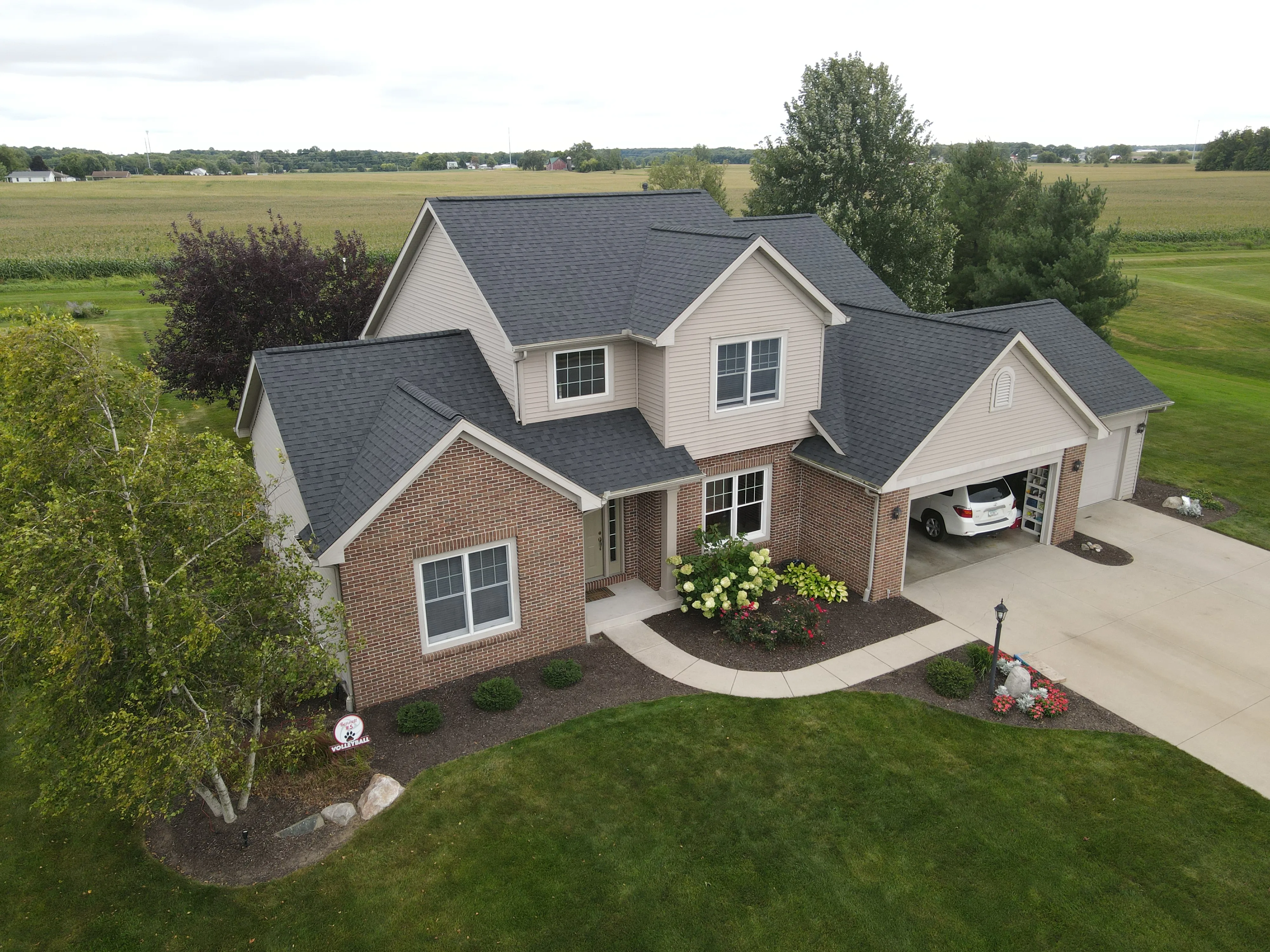 Aerial view of a large light-colored house with a dark gray roof, attached three-car garage, landscaped garden beds, and a green lawn surrounded by trees.